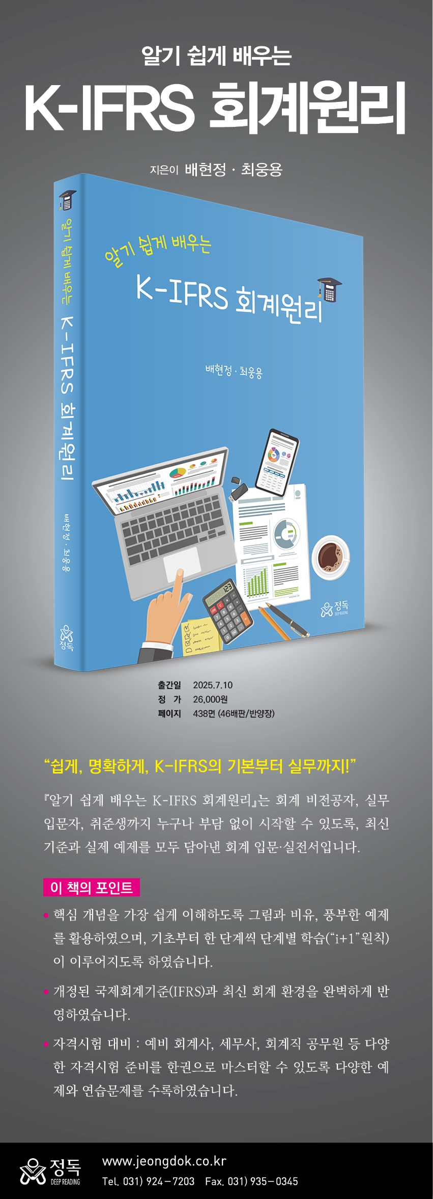 µÑ°, ȸ°è¿ø¸®¸¦ óÀ½ °øºÎÇÏ´Â µ¶ÀÚµéÀÌ È¸°è°¡ ¾î·Æ°í ³Ñ±â Èûµç À庮ÀÌ ÀÖ´Ù´Â µÎ·Á¿òÀ» ¹þ¾î³ªµµ·Ï ¹«¾ùº¸´Ùµµ ½±°Ô ¼³¸íÇÏ·Á°í ³ë·ÂÇÏ¿´´Ù. ÀúÀÚµéÀº ÀڽŵéÀÇ °ÀÇ °æÇè°ú ³ëÇϿ츦 ±³Àç¿¡ ÃÖ´ëÇÑ ¹Ý¿µÇϰí, ÇлýµéÀÇ ¹ÝÀÀ°ú Áú¹®»çÇ×µéÀ» ÀÌ Ã¥¿¡ ´ã¾Æ µ¶ÀÚµéÀÇ ÀÌÇØ¸¦ µ½±â À§ÇØ ¸¹Àº ³ë·ÂÀ» ±â¿ï¿´´Ù. ¼¼¿ùÀÌ È帣°í ÇлýµéÀÇ °ü½É»çµµ ´Þ¶óÁö°í ¾î·Æ°í º¹ÀâÇÑ Áú¹®¿¡ ´ëÇØ¼´Â ÀΰøÁö´ÉÀ» Àû±ØÀûÀ¸·Î Ȱ¿ëÇÏ´Â ÀþÀº ¼¼´ëµé¿¡°Ô ½±°Ô ´Ù°¡°¥ ¼ö Àִ ȸ°è¿ø¸®°¡ µÇµµ·Ï ³ë·ÂÇÏ¿´´Ù. ¿¹ÄÁ´ë, Â÷º¯°ú ´ëº¯ÀÇ ¿ë¾î ¼³¸í, Àç°íÀÚ»êÀÇ Àú°¡¹ý Àû¿ë, ´çÁ°ŷ¡, ±ÝÀ¶»óǰÀÇ È¸°èó¸®, °ü°è±â¾÷ÅõÀÚÁÖ½Ä, À¯ÇüÀÚ»êÀÇ Æò°¡(¿ø°¡¸ðÇü°ú ÀçÆò°¡¸ðÇü), ÁÖ´ç¼øÀÌÀÍ µî¿¡ ´ëÇÑ È¸°è󸮸¦ ½¬¿î ¿¹½Ã, ºñÀ¯, ±×¸² µîÀ» ÅëÇÏ¿© ±× ¿ø¸®¸¦ ½±°Ô ÀÌÇØÇÒ ¼ö ÀÖµµ·Ï ÇÏ¿´´Ù.
