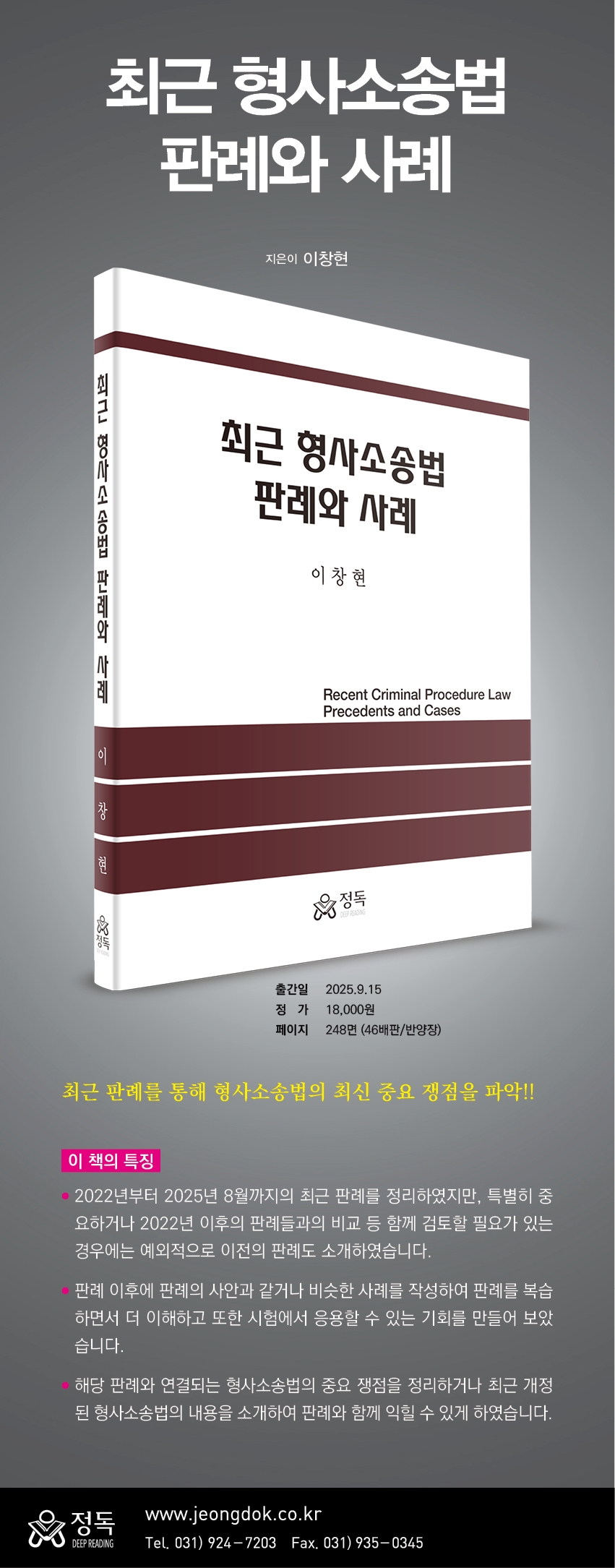 ÀÌ Ã¥ÀÇ ³»¿ëÀ̳ª Ư¡À» ¼Ò°³ÇÏ¸é ´ÙÀ½°ú °°½À´Ï´Ù. ù°, ¿øÄ¢ÀûÀ¸·Î 2022³âºÎÅÍ 2025³â 8¿ù±îÁöÀÇ ÃÖ±Ù ÆÇ·Ê¸¦ Á¤¸®ÇÏ¿´Áö¸¸ Ưº°È÷ Áß¿äÇϰųª 2022³â ÀÌÈÄÀÇ ÆÇ·Êµé°úÀÇ ºñ±³ µî ÇÔ²² °ËÅäÇÒ Çʿ䰡 ÀÖ´Â °æ¿ì¿¡´Â ¿¹¿ÜÀûÀ¸·Î 2022³â ÀÌÀüÀÇ ÆÇ·Êµµ ¼Ò°³ÇÏ¿´½À´Ï´Ù. ±×¸®°í ÆÇ·ÊÀÇ ³»¿ëÀº ±×´ë·Î À¯ÁöÇϸ鼵µ ¨ç, ¨è³ª Ⓐ, Ⓑ¿Í °°Àº ¼ø¹øÇ¥½Ã, ¹ØÁÙ°ú ÁøÇÑ ±Û¾¾ µîÀ¸·Î °¡´ÉÇÏ¸é ÆÇ·Ê¸¦ Àаí ÀÌÇØÇϱ⠽±µµ·Ï ³ë·ÂÇÏ¿´½À´Ï´Ù. µÑ°, ÆÇ·Ê ÀÌÈÄ¿¡ ÆÇ·ÊÀÇ »ç¾È°ú °°°Å³ª ºñ½ÁÇÑ »ç·Ê¸¦ ÀÛ¼ºÇÏ¿© ÆÇ·Ê¸¦ º¹½ÀÇÏ¸é¼ ´õ ÀÌÇØÇÏ°í ¶ÇÇÑ ½ÃÇè¿¡¼ ÀÀ¿ëÇÒ ¼ö ÀÖ´Â ±âȸ¸¦ ¸¸µé¾î º¸¾Ò½À´Ï´Ù. µû¶ó¼ 1ȸµ¶À» ÇÑ ÈÄ¿¡´Â ÆÇ·Ê¿Í »ç·Ê Áß¿¡ Çϳª¸¸À¸·Î »¡¸® º¹½ÀÀ» ÇÏ¸é ½Ã°£À» Àý¾àÇÒ ¼öµµ ÀÖÀ» °ÍÀÔ´Ï´Ù. ¼Â°, ÇØ´ç ÆÇ·Ê¿Í ¿¬°áµÇ´Â Çü»ç¼Ò¼Û¹ýÀÇ Áß¿ä ÀïÁ¡À» Á¤¸®Çϰųª ÃÖ±Ù °³Á¤µÈ Çü»ç¼Ò¼Û¹ýÀÇ ³»¿ëÀ» ¼Ò°³ÇÏ¿© ÆÇ·Ê¿Í ÇÔ²² ÀÍÈú ¼ö ÀÖ°Ô ÇÏ¿´½À´Ï´Ù. ÁÖ¿ä ÀïÁ¡À¸·Î´Â ¨ç ÇöÇà¹üüÆ÷ ¿ä°ÇÀ¸·Î¼ÀÇ ¡®Ã¼Æ÷ÀÇ Çʿ伺¡¯ ÆÇ´Ü±âÁØ, ¨è ½ÇÁúÀû ÇǾмöÀÚ¿¡ ÇØ´ç ¿©ºÎ, ¨é Á¤º¸ÀúÀå¸Åü¿¡ ´ëÇÑ ÀÓÀÇÁ¦Ãâ¹° ¾Ð¼ö¿Í Áõ°Å´É·Â ÀÎÁ¤ ¿©ºÎ, ¨ê ÀüÀÚÁ¤º¸¿¡ ´ëÇÑ ¾Ð¼ö․¼ö»ö¿¡¼ÀÇ ÆÇ·Ê ÃßÀÌ, ¨ë ¾Ð¼ö․¼ö»ö¿µÀå¿¡ ¡®¾Ð¼öÇÒ ¹°°Ç¡¯ÀÇ Æ¯Á¤ Á¤µµ, ¨ì Åë½ÅÁ¦ÇÑÁ¶Ä¡, Åë½Å»ç½ÇÈ®ÀÎÀÚ·á, Åë½ÅÀÚ·áÀÇ ±¸º°°ú ÇØ´ç ¿µÀå, ¨í °ø¼ÒÀ庯°æ °ü·Ã ÀïÁ¡ ¿ä¾à, ¨î À§¹ý¼öÁýÁõ°Å¹èÁ¦¹ýÄ¢ÀÇ ¿¹¿Ü·Î Áõ°Å´É·ÂÀÌ ÀÎÁ¤µÈ °æ¿ì µî ÀÔ´Ï´Ù.
