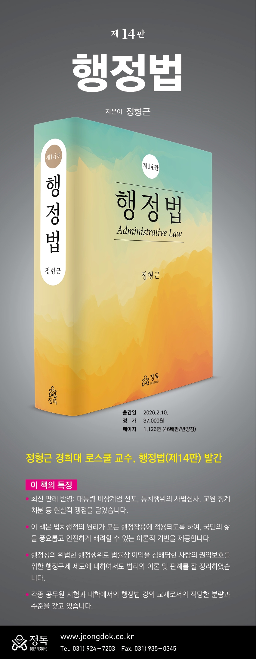 2026³â »õÇØ¸¦ ¸ÂÀÌÇÏ¸é¼ »õ·Î¿î Ã¥ ÇàÁ¤¹ý Á¦14ÆÇÀ» Ãâ°£ÇÏ°Ô µÈ °ÍÀ» °¨»çÇÏ°Ô »ý°¢ÇÑ´Ù. ÇàÁ¤±ÇÀ» Çà»çÇÏ´Â ±¹°¡¿Í Áö¹æÀÚÄ¡´Üü´Â ¹ý¿¡ µû¸¥ ÇàÁ¤ÀÇ ¿øÄ¢À» ÁؼöÇØ¾ß ÇÑ´Ù. ±Ç·ÂÀ» Çà»çÇÏ´Â ±â°üÀº ³²¿ëÀÇ À§ÇèÀÌ Àֱ⠶§¹®¿¡ ¹ýÀÌ Á¤ÇÏ´Â ÅëÁ¦¸¦ ¹Þ¾Æ¾ß ÇÑ´Ù. ¹ýÀÌ ÁöÇâÇÏ´Â Á¤ÀÇ´Â Àû¹ýÇÑ ÀýÂ÷¸¦ ÅëÇØ¼ ±¸ÇöµÇ±â ¶§¹®¿¡ ½ÇüÀû․ÀýÂ÷ÀûÀÎ ¹ý¸®ÀÇ ¿¬±¸¿Í Á¦µµÀÇ °³¼±ÀÌ ÇÊ¿äÇÏ´Ù.