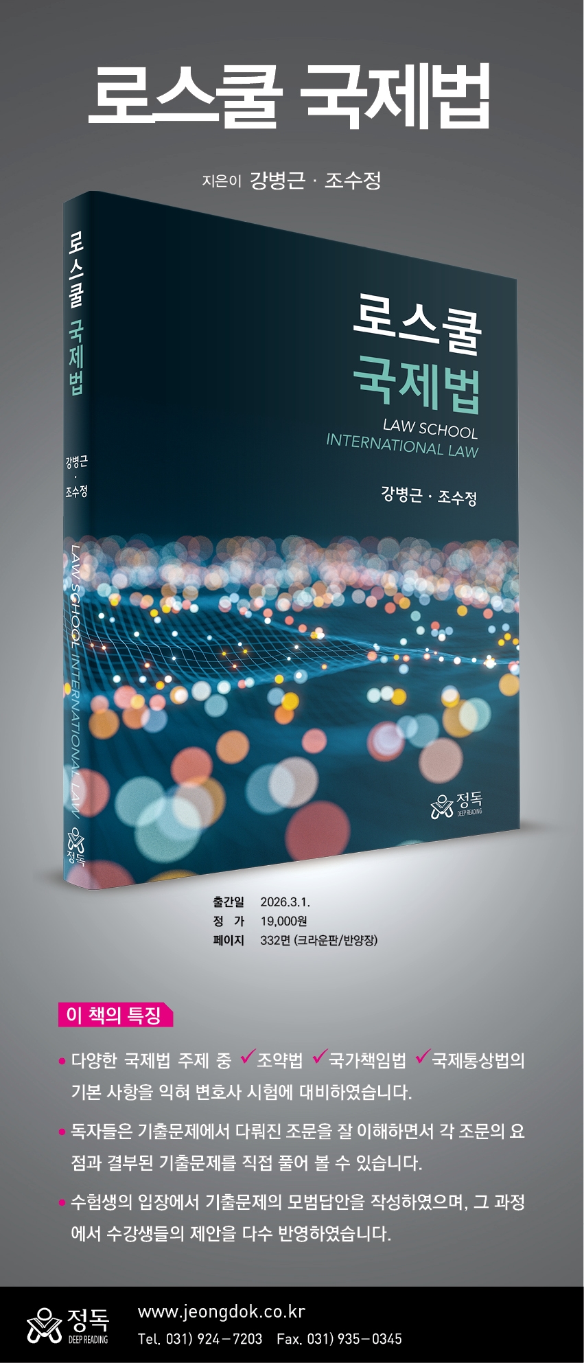 ÀÌ Ã¥Àº ´Ù¾çÇÑ ±¹Á¦¹ý ÁÖÁ¦ Áß Á¶¾à¹ý, ±¹°¡Ã¥ÀÓ¹ý, ±¹Á¦Åë»ó¹ýÀÇ ±âº» »çÇ×À» ÀÍÇô¼ º¯È£»ç ½ÃÇèÀ» ÁغñÇϱâ À§ÇÏ¿© Á¦À۵Ǿú´Ù. ±¹Á¦¹ý ¼±Åðú¸ñÀÇ ´ä¾ÈÁö¸¦ ÀÛ¼ºÇÒ ¶§ ½ÃÇè ¹üÀ§¿¡ ÇØ´çÇÏ´Â Á¶¹®Àº 100¿© °³Àε¥ ÀÌ Áß ¼ö½Ê °³ÀÇ Á¶¹®À» ÀÌÇØÇÏ¿© Ȱ¿ëÇÒ ¼ö ÀÖ´Ù¸é ±¹Á¦¹ýÀº ½Ã°£ ´ëºñ È¿À²¼ºÀÌ ¸Å¿ì ³ôÀº ¼±Åðú¸ñÀÌ´Ù. µ¶ÀÚµéÀº ±âÃâ¹®Á¦¿¡¼ ´Ù·ïÁø Á¶¹®À» Àß ÀÌÇØÇÏ¸é¼ °¢ Á¶¹®ÀÇ ¿äÁ¡°ú °áºÎµÈ ±âÃâ¹®Á¦¸¦ Á÷Á¢ Ç®¾î ºÁ¾ß ÇÒ °ÍÀÌ´Ù. ÀúÀÚµéÀº °í·Á´ëÇб³ ¹ýÇÐÀü¹®´ëÇпø¿¡¼ ±¹Á¦¹ý ½ÃÇè ´ëºñ °ú¸ñÀ» °ÀÇÇÏ¸é¼ ÀÌ Ã¥ÀÇ ³»¿ëÀ» Á¤¸®ÇÏ¿´´Ù. ÀúÀÚµéÀº ¼öÇè»ýÀÇ ÀÔÀå¿¡¼ ±âÃâ¹®Á¦ÀÇ ¸ð¹ü´ä¾ÈÀ» ÀÛ¼ºÇÏ¿´´Ù. ¸ð¹ü´ä¾ÈÀ» Á¤¸®ÇÏ´Â °úÁ¤ Áß¿¡ ¼ö°»ýµéÀÇ ÁÁÀº Á¦¾ÈÀ» ´Ù¼ö ¹Ý¿µÇÏ¿´´Ù. µ¶ÀÚ Áß ÀϺδ ÀúÀڵ麸´Ù ´õ ³ªÀº ¸ð¹ü´ä¾ÈÀ» Á¦½ÃÇÒ ¼öµµ ÀÖÀ» °ÍÀÌ´Ù.