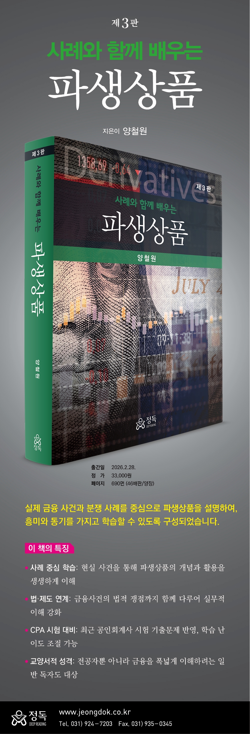 Á¦2ºÎ Çѱ¹ÀÇ ±ÝÀ¶È¯°æ¿¡¼´Â 8Àå ±ÝÀ¶½Ã½ºÅÛ°ú 9Àå ¹ý·ü ºÎºÐÀ» ÃÖ±Ù ÇöȲÀ» ¹Ý¿µÇÏ¿© º¸¿ÏÇÏ¿´´Ù. Á¦3ºÎ »ç·Ê´Â Çѱ¹¿¡¼ À̽´°¡ µÈ ÆÄ»ý»óǰµéÀ» ½Ã´ë¼øÀ¸·Î ¹è¿ÇÏ¿´´Ù. Á¦ÀÏ Ã¹ »ç·Ê°¡ 1997³â »çȸÀû ¹®Á¦°¡ µÈ ´ÙÀ̾ƸóµåÆÝµåÀÇ ÃѼöÀͽº¿Ò(TRS) °è¾àÀÌ´Ù. ÀÌÈÄ 30¿© ³â ±â°£ µ¿¾È Çѱ¹»çȸ¿¡ Áß¿äÇÑ ¿µÇâÀ» ÁØ ÆÄ»ý»óǰµéÀº ´ëºÎºÐ ´Ù·ç¾ú´Ù°í »ý°¢µÈ´Ù. À̸¦ ÅëÇØ Çѱ¹»çȸÀÇ ¸ð½À°ú ¹ßÀü °úÁ¤¿¡ ´ëÇØ¼µµ »ý°¢Çغ¸¸é ¸¹Àº ±³ÈÆÀ» ¾òÀ» ¼ö ÀÖÀ» °ÍÀÌ´Ù. ¶ÇÇÑ 3ºÎ »ç·Ê ºÎºÐ¿¡¼´Â ÃÖ±Ù »ç·Ê 2°³¸¦ Ãß°¡ÇÏ¿´´Ù. »ç·Ê Áß 11Àå ½º¿Ò, 12Àå Àüȯ»çä, 13Àå ½ÅÁÖÀμö±ÇºÎ»çä, 15Àå ŰÄÚ µîÀÇ ÆÄ»ý»óǰÀº °øÀÎȸ°è»ç(CPA) ½ÃÇè¿¡ ÃâÁ¦µÈ ÀûÀÌ ÀÖÀ¸¸ç, ÀÌ·± »ç·Ê´Â ¾Ë¾Æº¸±â ½±µµ·Ï ¸ñÂ÷¿¡ *Ç¥½Ã¸¦ ÇÏ¿´´Ù. ±âÃâ¹®Á¦µéÀ» ÇØ´ç Àå¿¡ ¿¹Á¦·Î ¼Ò°³ÇÏ¿´´Ù. °øÀÎȸ°è»ç(CPA) ½ÃÇèÀ» ÁغñÇÏ´Â ÇлýµéÀº 1ºÎ ³»¿ë»Ó¸¸ ¾Æ´Ï¶ó 3ºÎ »ç·Êµé Áß¿¡¼ ÀÌ ºÎºÐ±îÁö ¹Ýµå½Ã °øºÎÇÏ±æ ¹Ù¶õ´Ù.
