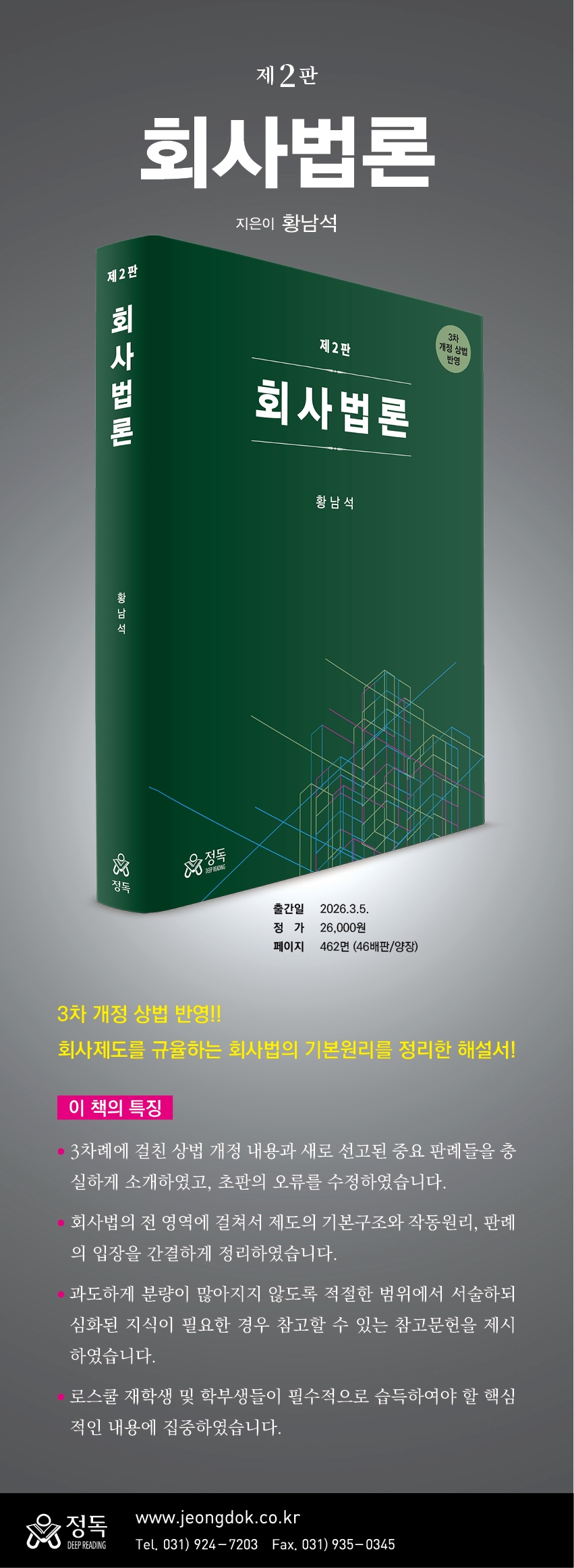 ÀÌÁ¦ ȸ»ç¹ý·ÐÀÇ Á¦2ÆÇÀ» ³»°Ô µÇ¾ú´Ù. 2025³â¿¡´Â µÎ Â÷·ÊÀÇ Áß¿äÇÑ »ó¹ý °³Á¤ÀÌ ÀÖ¾ú´Ù. 2025³â 7¿ùÀÇ Á¦1Â÷ »ó¹ý °³Á¤¿¡¼´Â ÀÌ»çÀÇ Ãæ½ÇÀǹ« ´ë»ó¿¡ ÁÖÁÖ¸¦ Ãß°¡Çϰí, »óÀåȸ»ç°¡ ¼±ÀÓÇÏ´Â »ç¿ÜÀÌ»çÀÇ ¸íĪÀ» µ¶¸³ÀÌ»ç·Î º¯°æÇÏ¸é¼ Àǹ«¼±ÀÓ ºñÀ²À» 3ºÐÀÇ 1·Î ¿Ã·È´Ù. ¶ÇÇÑ ÀÏÁ¤ÇÑ »óÀåȸ»ç°¡ Àǹ«ÀûÀ¸·Î ¼³Ä¡ÇÏ¿©¾ß ÇÏ´Â °¨»çÀ§¿øÀÇ ¼±ÀÓ․ÇØÀӽà ÃÖ´ëÁÖÁÖÀÇ ¹ßÇàÁÖ½ÄÃѼöÀÇ 3ÆÛ¼¾Æ® Ãʰú º¸À¯ ¿©ºÎ¸¦ Ư¼ö°ü°èÀÎ µî°ú ÇÕ»êÇÏ¿© ÆÇ´ÜÇϵµ·Ï ÇÏ¿´À¸¸ç »óÀåȸ»ç¿¡ ´ëÇÏ¿© ÀüÀÚÁÖÁÖÃÑȸ¸¦ º´Çà°³ÃÖÇÒ ¼ö ÀÖµµ·Ï Çϰí ÀϺΠ»óÀåȸ»ç´Â º´Çà°³ÃÖ¸¦ °Á¦ÇÏ¿´´Ù. °°Àº ÇØ 9¿ùÀÇ Á¦2Â÷ »ó¹ý °³Á¤¿¡¼´Â ´ë±Ô¸ð »óÀåȸ»ç´Â Á¤°üÀ¸·Î ÁýÁßÅõÇ¥Á¦¸¦ ¹èÁ¦ÇÒ ¼ö ¾øµµ·Ï ÇÏ°í ´ë±Ô¸ð »óÀåȸ»ç°¡ ¼³Ä¡ÇÏ´Â °¨»çÀ§¿øÈ¸ÀÇ À§¿ø Áß ºÐ¸®¼±ÀÓ ´ë»óÀ» ÃÖ¼Ò 1¸í¿¡¼ 2¸íÀ¸·Î È®´ëÇÏ¿´´Ù. Á¦2ÆÇÀÇ °³Á¤ ÀÛ¾÷À» ¸¶¹«¸®ÇÒ ¹«·Æ ÀÚ±âÁÖ½Ä ¼Ò°¢Àǹ«¸¦ ÁÖ¿ä ³»¿ëÀ¸·Î ÇÏ´Â Á¦3Â÷ »ó¹ý °³Á¤ÀÌ ÁøÇàµÇ¾î ±× ³»¿ëµµ Ãæ½ÇÇÏ°Ô ¹Ý¿µÇÏ¿´´Ù. Á¦2ÆÇ¿¡¼´Â ÀÌó·³ 3Â÷·Ê¿¡ °ÉÄ£ »ó¹ý °³Á¤ ³»¿ë°ú »õ·Î ¼±°íµÈ Áß¿ä ÆÇ·ÊµéÀ» Ãæ½ÇÇÏ°Ô ¼Ò°³ÇÏ¿´°í, ÃÊÆÇÀÇ ¿À·ù¸¦ ¼öÁ¤ÇÏ¿´À¸¸ç ¼³¸íÀÌ ºÎÁ·ÇÑ ºÎºÐÀº ÀÌÇØÇϱ⠽±°Ô ´Ùµë¾ú´Ù. ƯÈ÷ Á¦2ÆÇÀº °æÈñ´ëÇб³ ¹ýÇÐÀü¹®´ëÇпøÀ» Á¹¾÷ÇÏ´Â ¹ÚÀç³², Àü¼ºÁØ, Á¶½ÂÈñ ÇлýÀÌ ±³Á¤À» µµ¿ÍÁÖ¾ú´Ù. À̵éÀº ´Ü¼øÇÑ ±³Á¤¿¡ ±×Ä¡Áö ¾Ê°í ¿©·¯ °³¼±Á¡À» Á¦¾ÈÇØ ÁÖ¾î Ã¥ÀÇ ³»¿ëÀÌ ´õ¿í dz¼ºÇØÁ³´Ù. ÀÌ ÀÚ¸®¸¦ ºô¾î °¨»çµå¸®°í ÈǸ¢ÇÑ ¹ý·ü°¡·Î ¼ºÀåÇϱ⸦ ±â¿øÇÑ´Ù. ¾î·Á¿î »óȲ ÇÏ¿¡¼ Á¦2ÆÇÀ» Ãâ°£ÇÏ¿© ÁֽбèÁß¿ë ´ëÇ¥´Ô°ú °ÅÄ£ ¿ø°í¸¦ ¸Å²ô·´°Ô ´Ùµë¾î Áֽнɼºº¸ ÀÌ»ç´Ô²² °¨»çµå¸°´Ù.